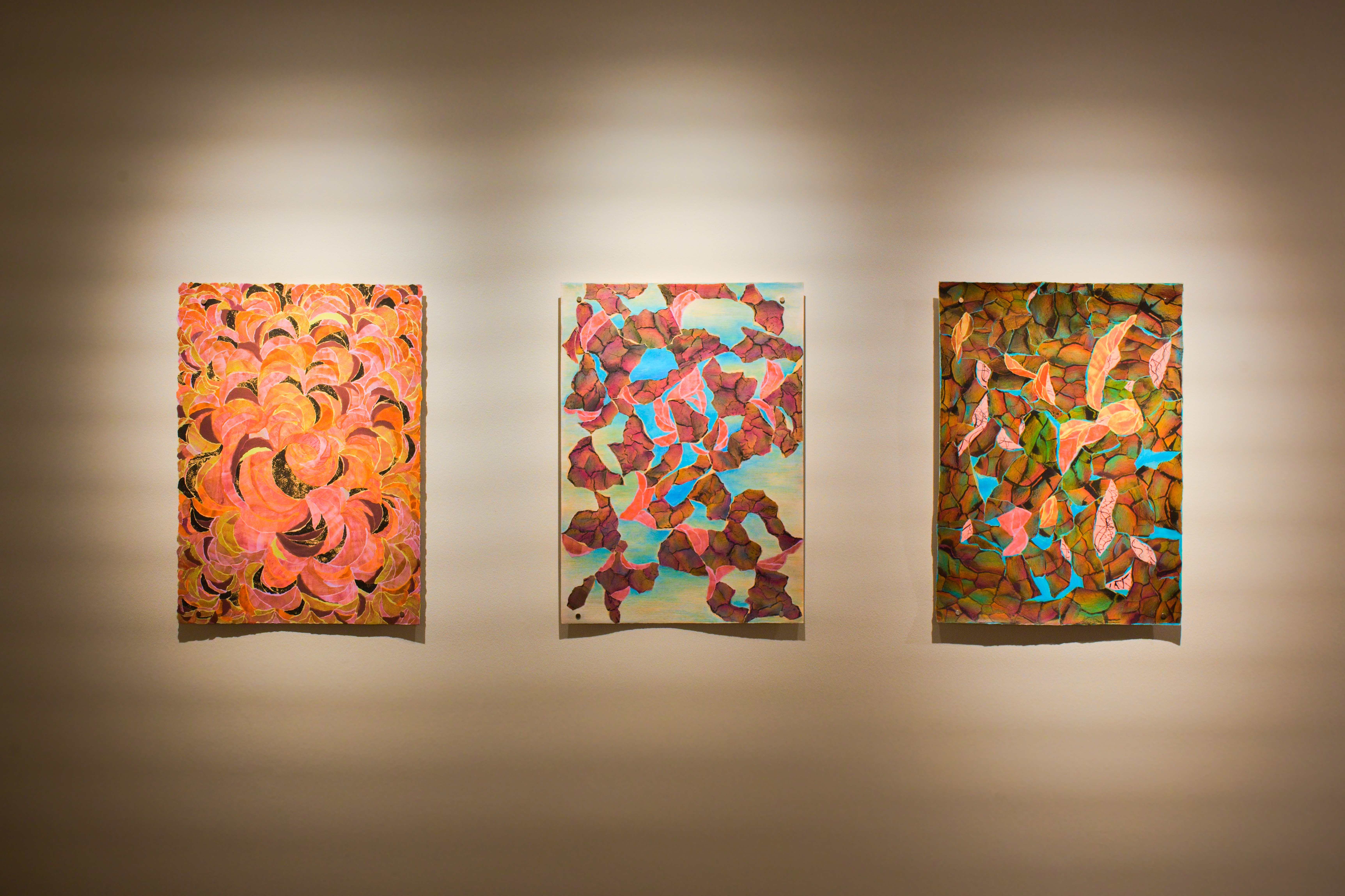 Autorka ve své tvorbě propojuje výtvarnou citlivost pro strukturu, kterou zobrazuje pracnou, téměř meditativní koláží. V jejích pracích vznikají krajiny, jež jsou současně geologické i duševní. Puklina je tu tělem i symbolem, rozhraním i vstupem – místem, kde se můžeme ztratit, ale také znovu začít. Výstava tematizuje napětí mezi povrchem a tím, co jej narušuje – mezi tichou tektonikou a náhlou, nečekanou explozí.